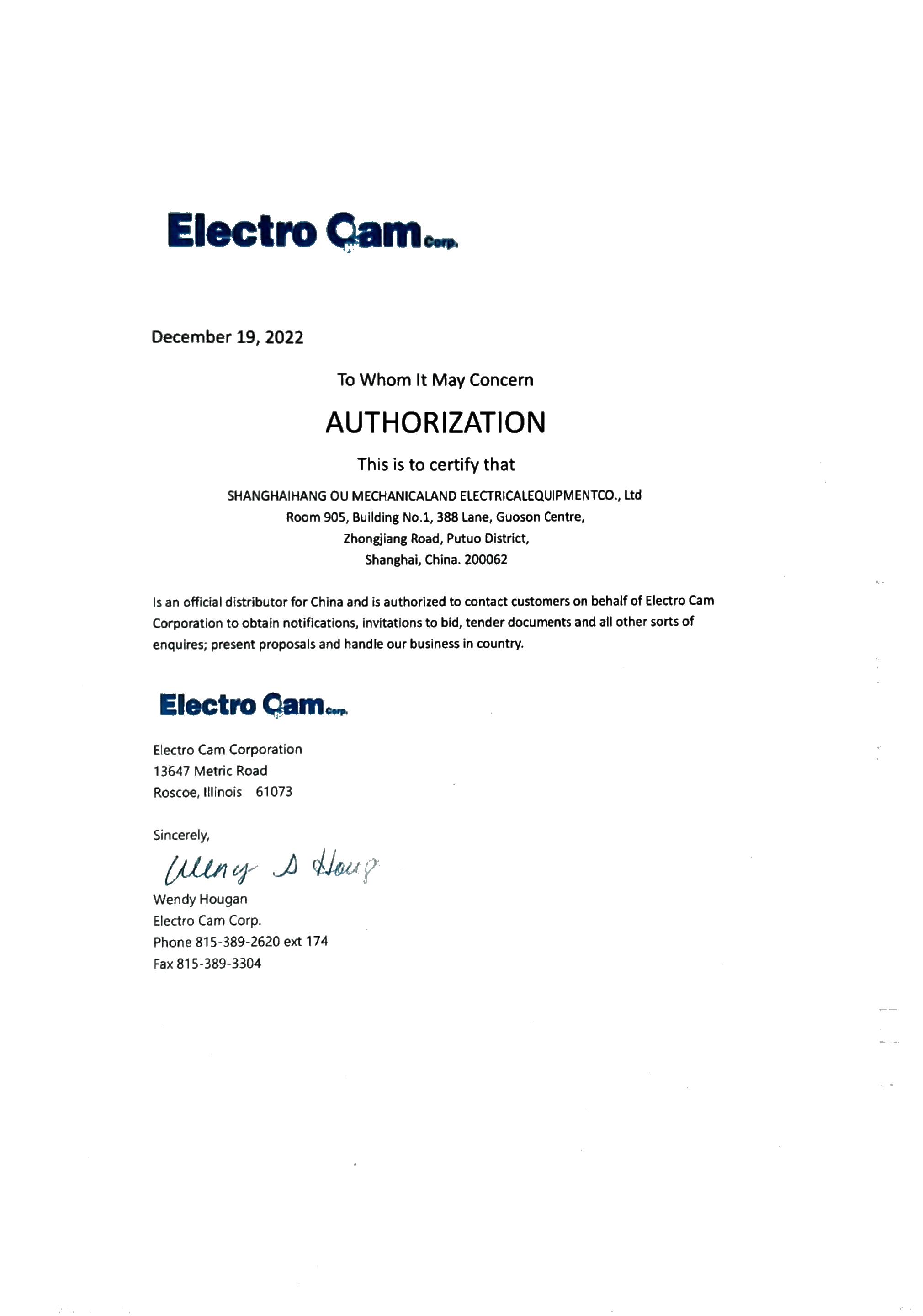 2022年Electrocam工廠授權上海航歐中國區代理