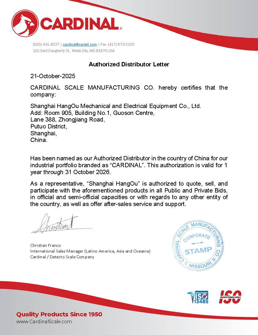 2025年美國CARDINAL工廠授權上海航歐中國區代理CARDINAL稱重傳感器